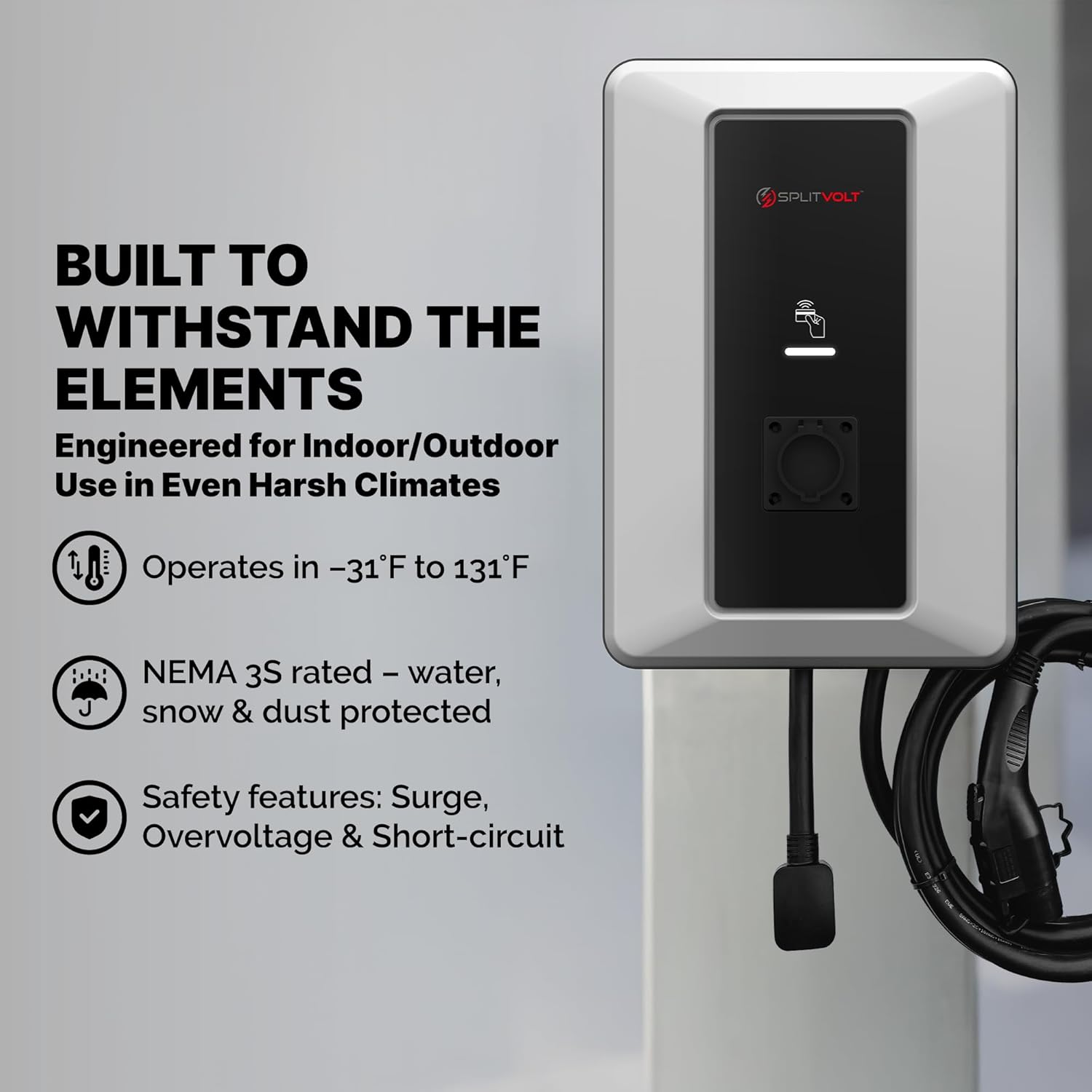 SAFE FOR INDOOR AND OUTDOOR USE – Feel confident charging your vehicle anywhere, anytime. This NEMA 3S weather-resistant charger is safety certified and built to protect against surges, overvoltage, and short circuits. With a wide operating range from -31°F to 131°F, it delivers reliable performance in rain, snow, dust, or extreme temperatures, ensuring your investment stays protected in outdoor environments.