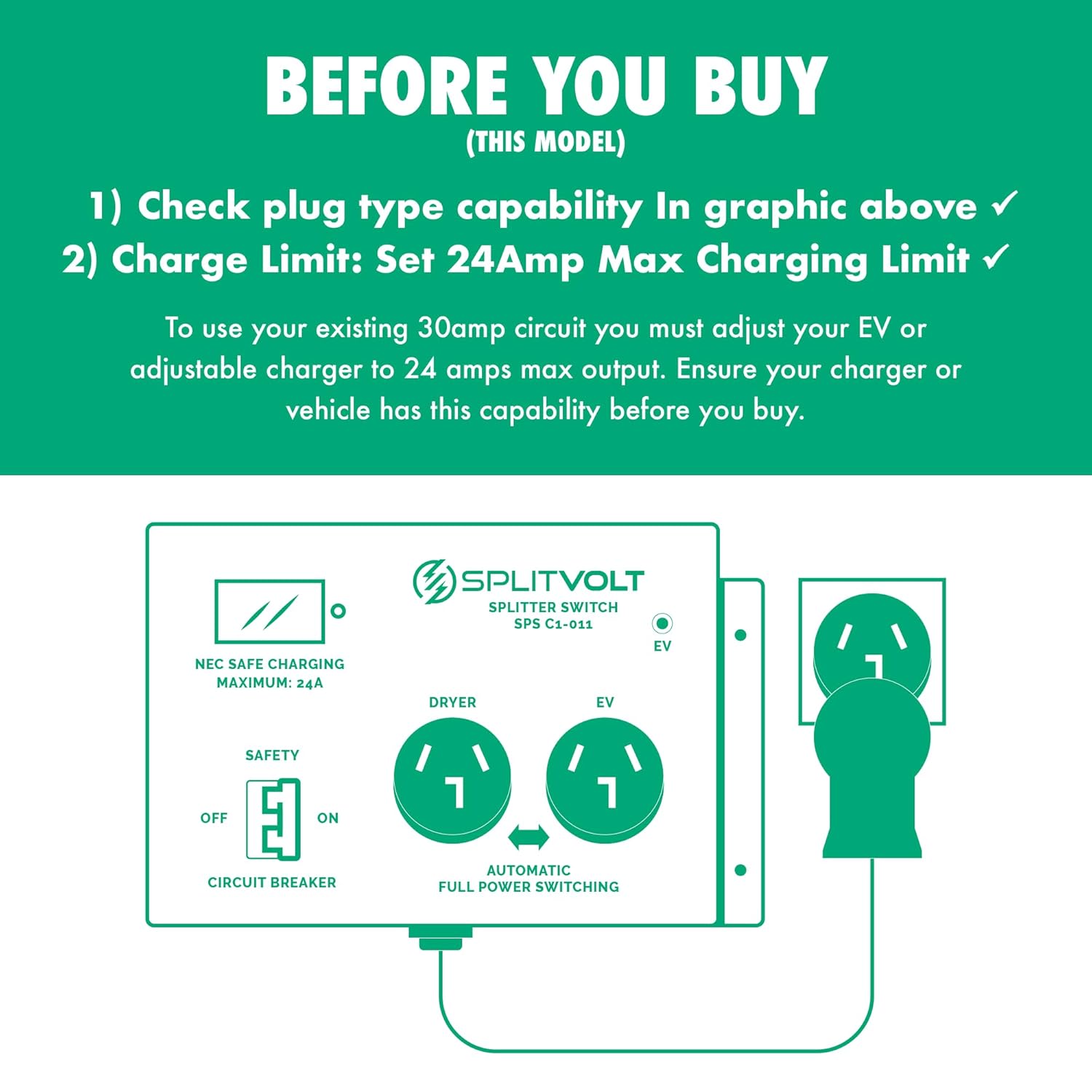 The Splitvolt Splitter Switch plugs into your existing, standard household NEMA 10-30 wall outlet, and provides two NEMA 10-30 outlets for use with your dryer and EV charger. Turn the switch to 'ON', and you've got fast home charging! It monitors, displays, and switches full 24A power automatically between attached devices. For this configuration, you must set your charger for a maximum safe charging rate of 24A or lower.