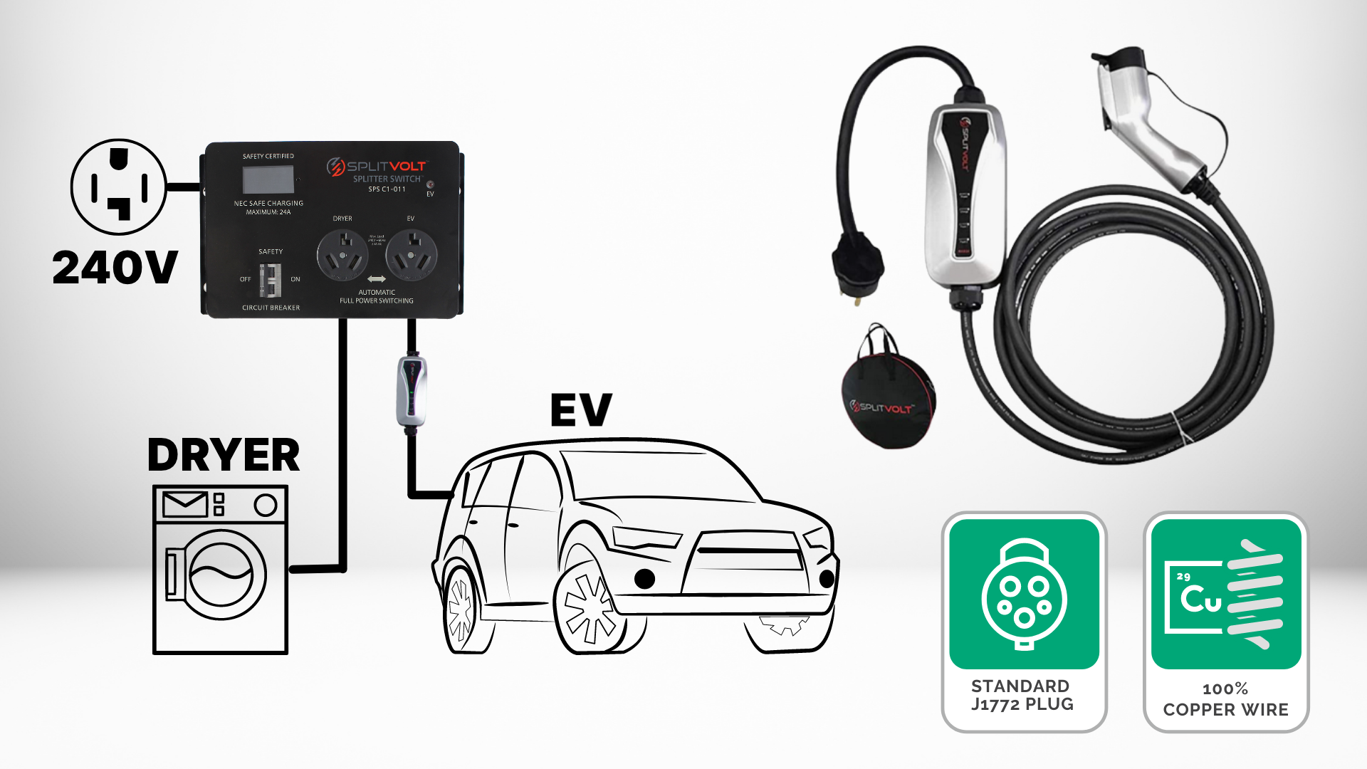 The Splitvolt 24 amp, Level 2 portable EV charger provides an average of 7 times faster charging than your manufacturer provided Level 1, 120V charger. It combines the fastest NEC safe-charging rate and best value price point using quality components, including 100% copper wiring.